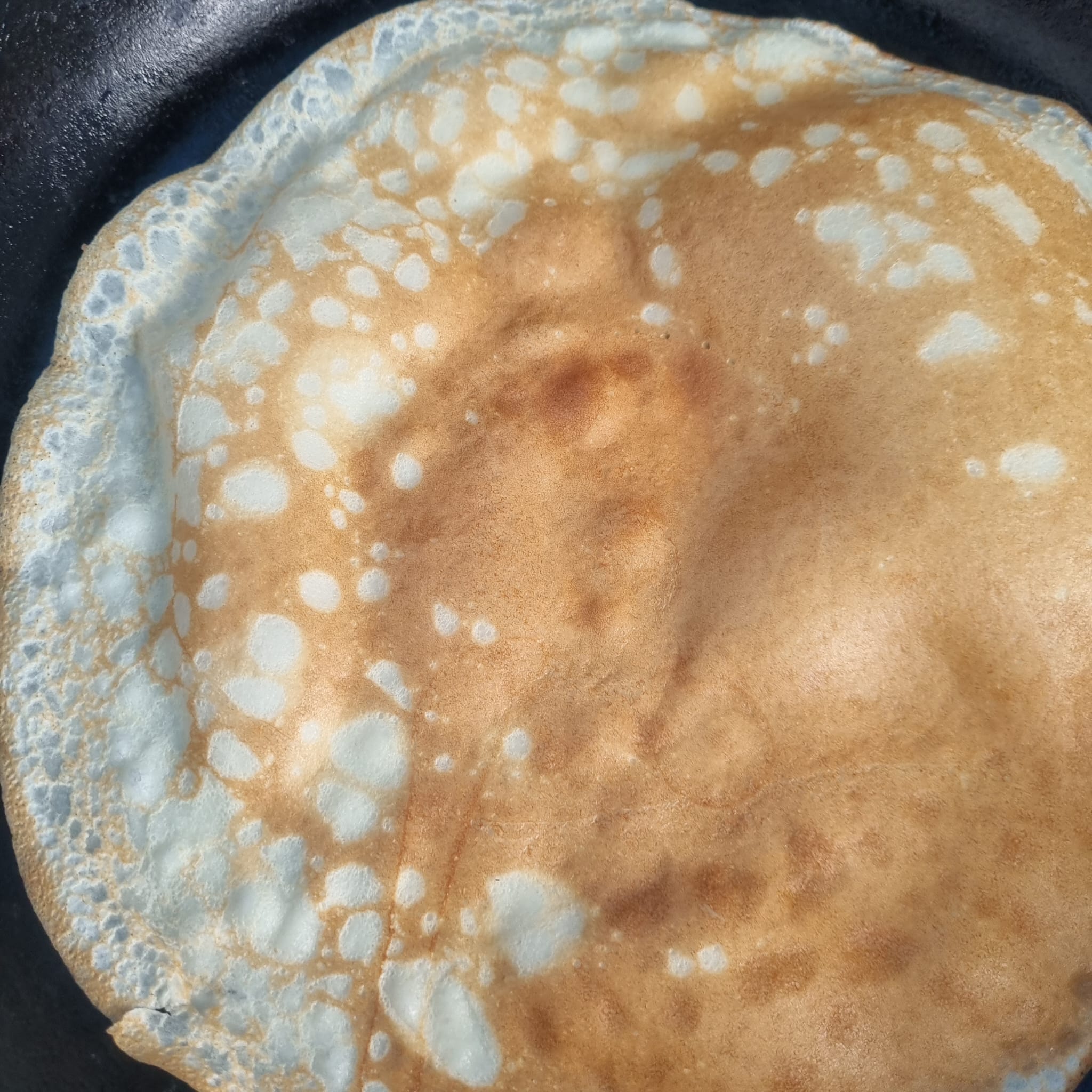 - Pour in enough batter to thinly coat the pan, swirl, and cook until the edges lift. Flip and cook briefly on the other side.